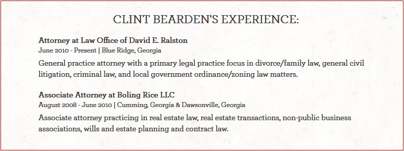Snapshot of law resume from Clint Bearden’s Website