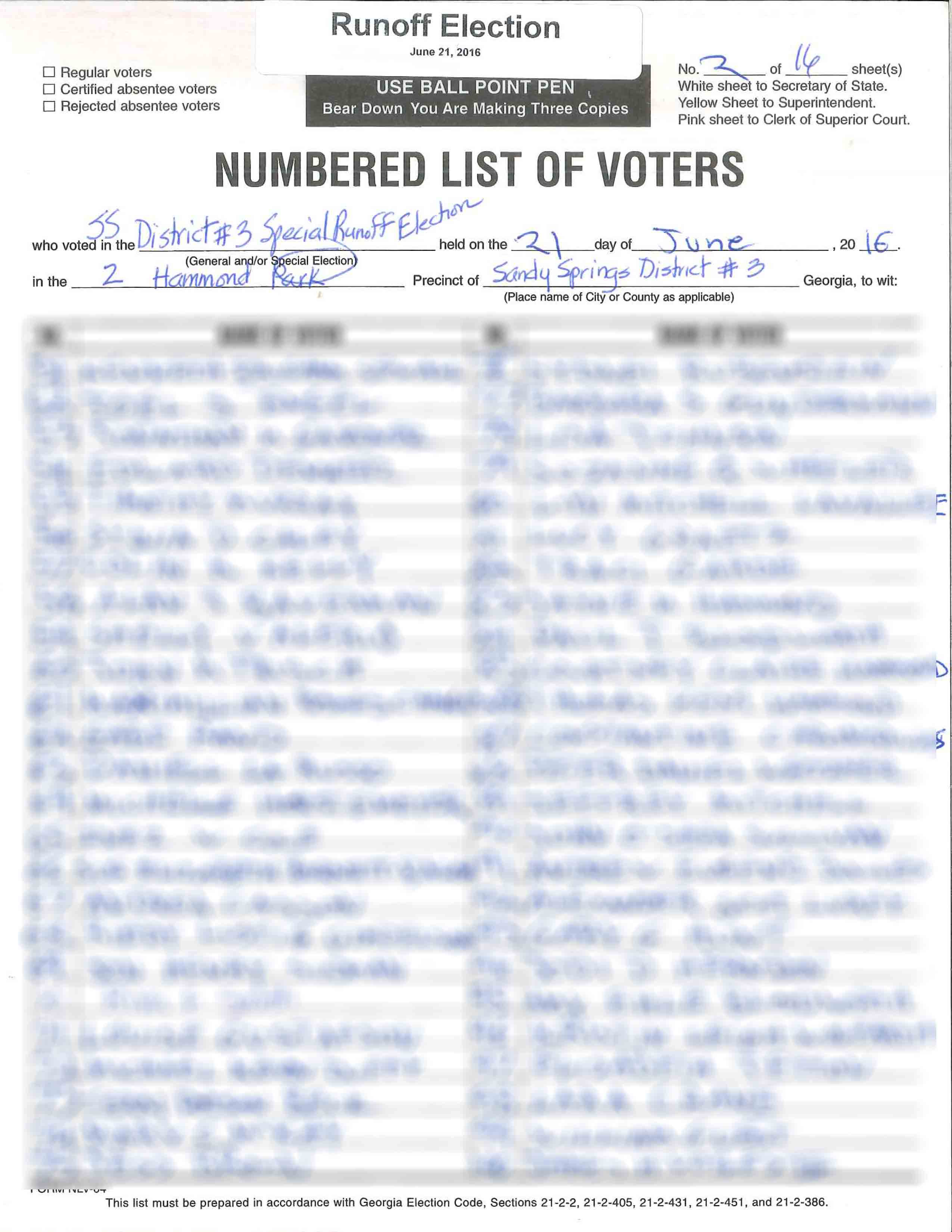 2) For both the Special Election, and the Special Election Run-off, rather than have electronic accounting of who voted, the City of Sandy Springs had to employ paper tracking sheets for the list of voters. This consisted of a triplicate Voting List form being filled-out by election personnel…some of whom it is clear never learned how to print names, or forgot that skill along the way in life. This is an example of the forms used (names have been deliberately blurred-out by me, but the PDF documents exist with the City Clerk’s office): Run-Off Example.